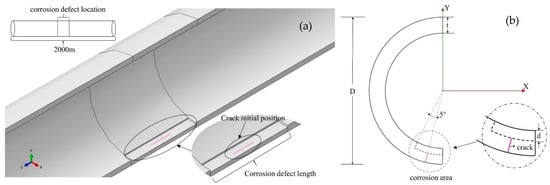The key to the technological development of long-distance gas pipelines lies in the balance between pipeline transportation efficiency and safety. In recent years, in the oil and gas transportation industry, in order to improve the transportation efficiency of pipelines, the operation of long-distance and high-pressure pipelines has become the norm. Under high internal pressure conditions, the risk of pipeline rupture will increase significantly. Especially when affected by other geological disasters such as earthquakes, the mechanical behavior of pipeline fractures will become more complex and dangerous. Earthquakes constitute a common natural disaster. Seismic waves propagate from the earthquake source to the ground, causing ground deformation. There are interactions between buried pipelines and surrounding soil, and pipelines will be damaged due to excessive deformation [,]. Detailed records of corrosion incidents are found in the “Metals Handbook” published by the American Society for Metals (ASM) []. For example, 65% of hazardous pipeline incidents between 1994 and 1999 were caused by corrosion in pipelines. There are various reasons for corrosion, mainly corrosion of pipeline transportation materials and corrosion of the soil environment. Buried pipeline networks will experience various complex soil environments such as alpine areas, undulating mountainous areas, and high-temperature areas, which greatly increases the risk of pipeline corrosion []. During the operation of long-distance pipelines, most of the environment is underground, making it difficult to monitor pipeline corrosion [,,,]. If the tiny cracks caused by corrosion cannot be discovered in time, they will not only have a great impact on the efficiency of oil and gas transportation but also cause damage to the soil environment around the pipeline, causing environmental pollution and soil erosion []. With the development of the social economy and the increasing demand for oil and natural gas, the reliability and safety analysis of buried pipelines has become more important.