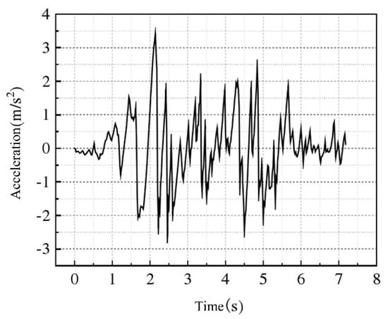 The incidence direction of the seismic wave propagating from the deep crust to the surface will gradually approach the vertical direction of the vertical–horizontal surface, and on this basis, the vertical incidence can be considered when the seismic wave input is carried out. In this study, the effect of vertical seismic waves on buried pipelines is analyzed by means of seismic wave input from the soil bottom. Seismic waves are selected according to site conditions, actual strong earthquake records, artificially simulated loads, and other reference points, and earthquake time history records suitable for buried pipelines are selected, as shown in Figure 5.