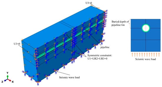 Because both the pipe and soil are highly symmetrical structures, symmetrical modeling of the pipe and soil is carried out in order to save calculation costs and facilitate the observation of crack locations, as shown in Figure 6. The central position of the pipeline is 1 m away from the top of the soil model, and the simulated pipeline burial depth is 1 m. The soil mass is a cuboid with a length of 20 m, a width of 2 m, and a height of 4 m. A symmetric constraint in the X direction is established along the middle section Z, and the constraint is set as U1 = UR2 = UR3 = 0. The variable pressure is added inside the pipeline to simulate the internal pressure of the material transported in the pipeline, and the displacement constraint is applied to the bottom of the soil to simulate the seismic load as shown in Figure 6.