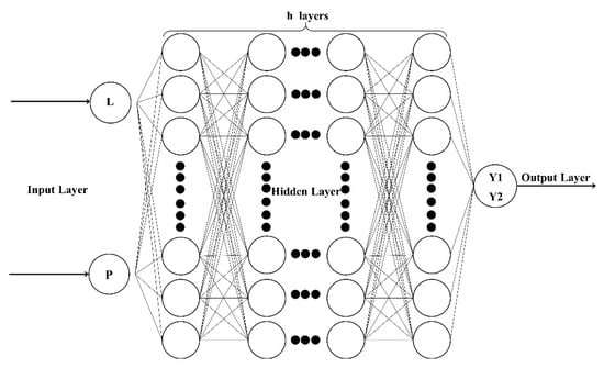 Parameters such as the number of hidden layer nodes, number of layers, and excitation functions in the BP neural network (BPNN) have a great impact on the prediction performance of the model. Currently, there is no definite method for selection [,,], and the network structure parameters need to be designed. The input vector of the model is the initial length L of the crack and the change in the internal pressure P. The output vector is the stress Y1 at the crack tip and the crack expansion length Y2 calculated in XFEM. The initial model is shown in Figure 8. The parameters such as the diameter, wall thickness, and length of the pipe are set to constant values, the initial crack length L ranges from 2 cm to 20 cm, and the internal pressure P ranges from 1 MPa to 4 MPa. The input layer of the initial model has 2 nodes, the output layer has 2 nodes, the hidden layer node is set to m, and the number of layers is set to h. The values of m and h need to be determined based on experimental tests.