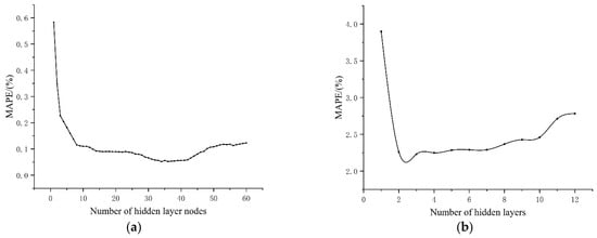 The relationship curve between MAPE and hidden layer. (a) Relationship curve between MAPE and hidden layer nodes. (b) Relationship curve between MAPE and number of hidden layers.