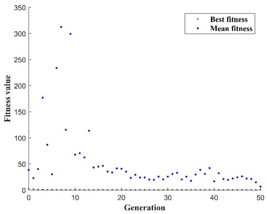 After 50 iterations in the GA-BPNN prediction model, the best fitness value and the average fitness value are not very different. The average fitness value tends to be stable. Although the optimal fitness value fluctuates slightly, it is basically stable within a certain range, as shown in Figure 10. The GA-BPNN model was constructed after 50 iterative calculations converged, proving that the previous parameter settings are reasonable.