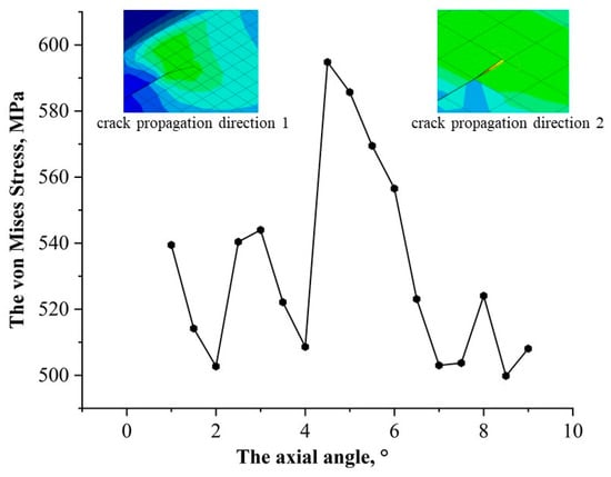 As shown in Figure 11, the middle position of the corrosion zone is the position when the crack circumferential angle changes to approximately 5°. The equivalent stress value of the crack tip at this position will have a larger value. After deviating from this angle, the stress value at the crack tip begins to decrease. It can be seen from the crack propagation direction in the corrosion area in Figure 11 that after reaching the maximum stress value, the crack tip propagation direction also changes, and the range of stress fluctuations also begins to decrease. It can be seen from the solution results of the Abaqus numerical model that the expansion length that appears in the middle of the corrosion area is smaller than that in other locations. According to the energy fracture criterion, when the energy release within the crack is small, the crack driving force at the crack tip will have a larger value. The above shows that under the same load, the circumferential position of the crack in the buried pipeline will have a significant impact on the crack tip stress field.
