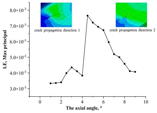 The strain at the crack tip corresponds to the stress change, and the relationship between stress and the circumferential angle is shown in Figure 12. When the circumferential angle reaches around 5°, the strain value at the crack tip reaches a maximum value, and then the strain value continues to decrease as the angle increases. This further explains that cracks at different circumferential positions on buried pipelines will have different tip strains even under the same load, and the position has a great influence on the crack tip stress field.