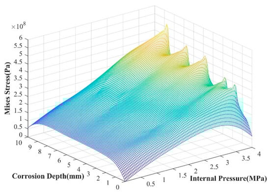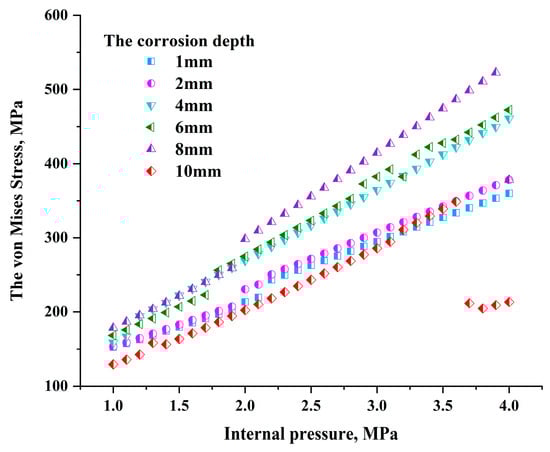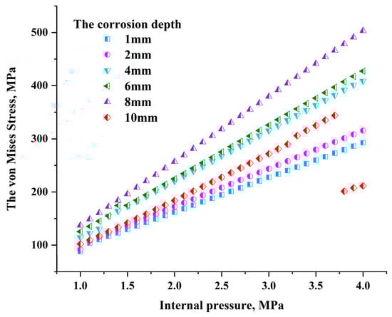 It can be seen from Figure 13 that under the action of only the internal pressure load of the pipeline, the stress value at the crack tip continues to increase. When the internal pressure of the pipeline changes between 1 MPa and 3.6 MPa, the crack tip stress at different corrosion depths shows an increasing trend. There is not much difference between the stress values at the crack tip of 4 mm and 6 mm depth. When the internal pressure of the pipeline is small, the crack tip in the corrosion area will have nearly coincident stress values, but when the corrosion depth increases to 8 mm, the stress will change significantly. As the internal pressure of the pipeline continues to increase, the increase in stress value at the crack tip with a corrosion depth of 8 mm is significantly greater than that of cracks with other depths, and the maximum stress value difference is approximately 100 MPa. When the depth reaches 10 mm, the corrosion degree of the pipe wall reaches 50%. When the internal pressure exceeds 3.6 MPa, the crack in the corrosion area expands and the stress value at the crack tip begins to decrease.