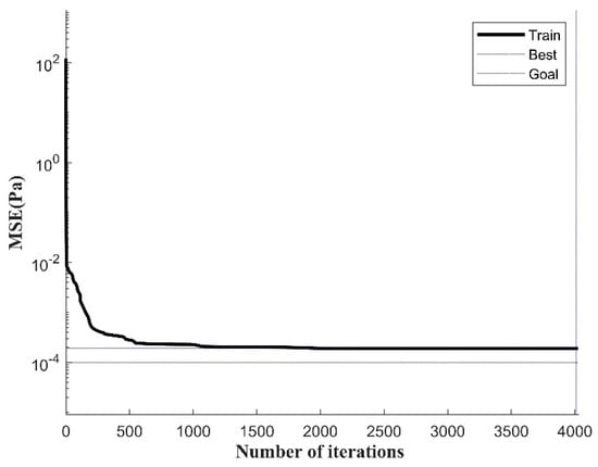 The mean square error (MSE) can intuitively determine the error between the predicted value and the true value. After model training, the training set data are exported through the saved neural network and error analysis is performed, as shown in Figure 15. The addition of seismic wave loads makes the stress changes at the crack tip in the corrosion area more complex. The BP neural network is prone to falling into local optimal solutions when dealing with nonlinear problems, making the model difficult to converge. In this case, the neural network model converges slowly and reaches the best training accuracy at 4027 iterations of training.