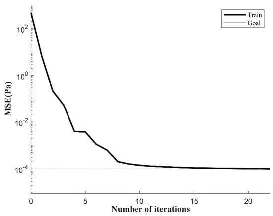 The initial weight matrix of the BPNN model is optimized using the global optimization capability of the GA algorithm and the adaptability of the optimization object, which improves the accuracy of the BPNN model and reduces the training cost. The GA-BPNN is used to predict and analyze the crack tip stress field under the joint action of seismic waves and pipeline internal pressure loads. As shown in Figure 17, during the iterative training process, the convergence of the GA-BPNN is significantly better than that of the BPNN, and the training time is greatly shortened. After 15 iterative calculations of the training data, the model has converged. When the number of iterations is 22, the training accuracy is 0.0001, reaching the expected training goal. At this time, the model has converged.
