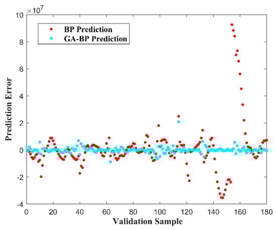 An additional 180 sets of data were used to conduct prediction error analysis on the GA-BPNN model. The data of the input node are the depth of the pipeline corrosion area, the internal pressure of the pipeline, and the length of the crack, and the data of the output node are the calculated values of the crack tip stress.