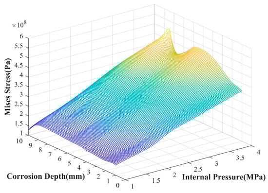 The input parameters are randomly selected within their respective value ranges to form sample data and introduced into the above model for prediction. The results are shown in Figure 16. As the corrosion depth increases, the difference in stress at the crack tip also changes. When the corrosion depth increases to 50%, large stress value fluctuations will occur, ranging from approximately 350 MPa to 500 MPa.