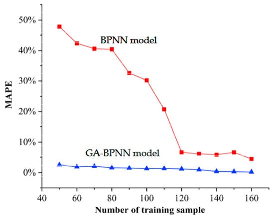 - A GA-BPNN prediction model was established, which improved the prediction accuracy and significantly reduced model training costs. After further analysis of several sets of data samples, the training time, mean absolute percentage error value, and calculation time of the two models were compared, and the GA-BPNN was determined to have better adaptability.
