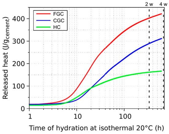 Released heat during hydration of three cements (FGC—fine-grained cement; CGC—coarse-grained cement; HC—hybrid cement).