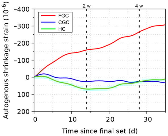 Autogenous shrinkage of three cements (FGC—fine-grained cement; CGC—coarse-grained cement; HC—hybrid cement).