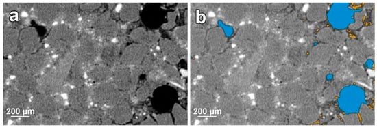 An example of an axial view of μ-CT slices inside the VOI (a) with voids indicated by black colour and (b) segmented entrapped-air voids (highlighted in blue colour) and formed microcracks (highlighted in orange colour) of a sample composed of fine-grained cement (FGC) aged for 4 weeks.