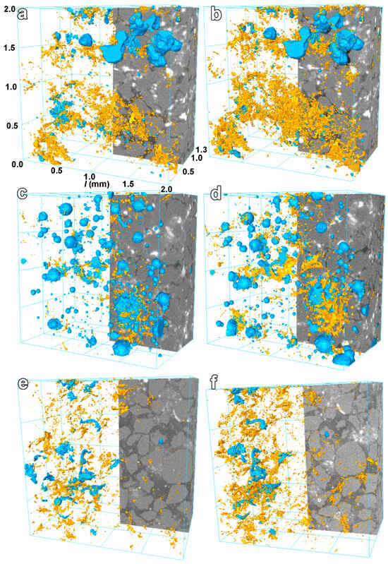 In addition, different voids can be separated due to their high morphological variations, mainly larger spherulitic entrapped-air voids and irregularly shaped smaller voids corresponding to the microcracks, highlighted in blue and orange colour, respectively, in Figure 4b. The 3D views of extracted air voids and microcracks within the VOIs of the tested micromortars are shown in Figure 5. The 3D visualization confirmed the findings from the limited 2D observations that most of the microcracks were present in close contact with entrapped-air voids and aggregate particles and distributed within the whole of the VOIs, suggesting their formation due to autogenous shrinkage, in agreement with previously published observations []. In general, the increased formation of microcracks around aggregate particles in so-called interfacial transition zones (ITZs) is explained in Portland-based cements by the wall effect with locally increased porosity and the presence of complex microstructure, including zones with large portlandite and ettringite crystals [] connected to the aggregates through the micrometric layer of the calcium silicate hydrate (C-S-H) layers. For this reason, ITZ usually represents the weakest part of a mortar for the initial formation of microcracks and their elongation and subsequent propagation []. In contrast, alkali-activated systems form a 3D polymer network with no characteristic gel porosity []. Such materials generally exhibit better bonding with aggregates [], reflected in their lower microcrack formation.