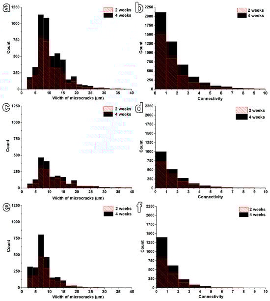 The quantitative evaluation of microcracks’ formation (on the left) and their connectivity development during sealed hydration of mortars composed of fine-grained cement (FGC; a,b), coarse-grained cement (CGC; c,d), and hybrid cement (HC; e,f).