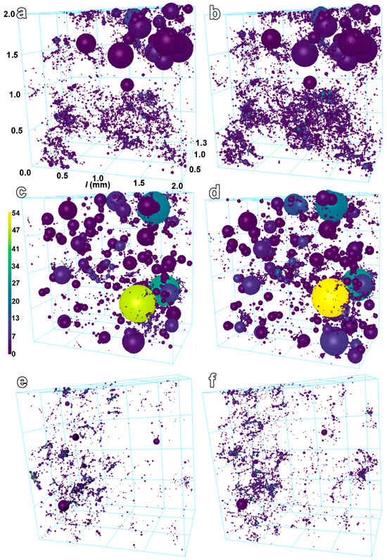 The graphical visualisation of simplified connectivity development of samples aged for 2 (on the left) and 4 weeks (on the right) composed of fine-grained cement (FGC; a,b), coarse-grained cement (CGC; c,d), and hybrid cement (HC; e,f). The size of the spheres is proportional to the pore volume. The dimensions of VOIs and colour scale bar characterising the connectivity are visualised in (a) and (c), respectively.