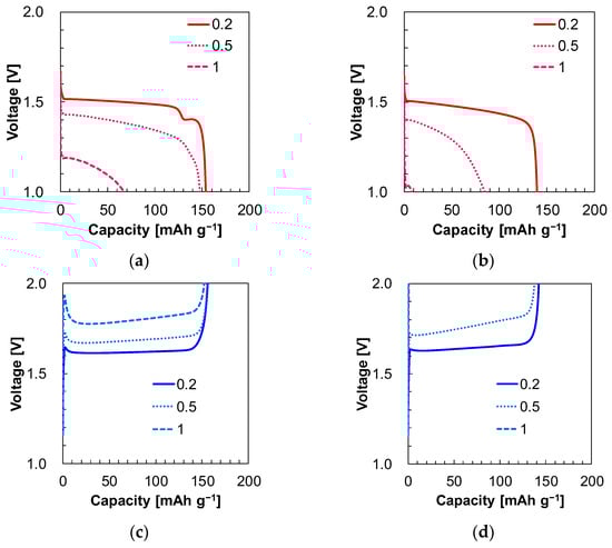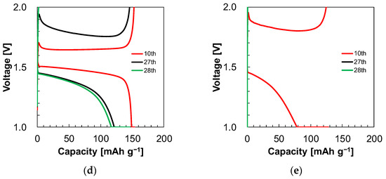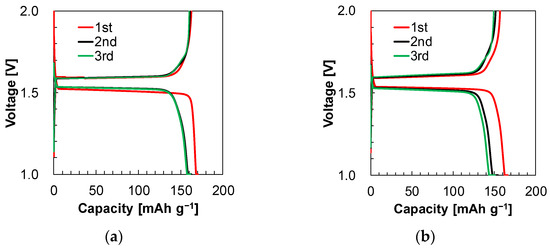 The initial characteristics of the batteries were evaluated at 25 °C with a charge/discharge tester (Meiden Hokuto (Tokyo, Japan), HJ1005SD8). The cut-off voltages for charge and discharge were 1.0 V and 2.0 V, respectively. The charging protocol was conducted at a rate of 0.1 C constant current-constant voltage (CC-CV). The cut-off current was 1/50 C. The discharge protocol was conducted at a rate of 0.1 C constant current (CC). The protocols were performed for three cycles for initial testing.