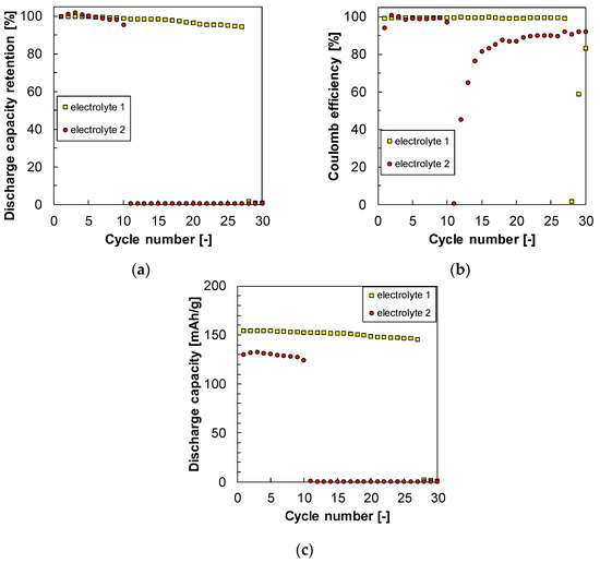The coulombic efficiencies of each battery are shown in Figure 4b. Prior to deterioration, all electrolytes had coulombic efficiencies exceeding 99%. Although the coulombic efficiency for electrolyte 2 appeared to recover after the capacity drop, it only corresponded to the cycles with relatively low capacities. Figure 4c shows the actual discharge capacities during the cycles. The capacity of the battery with electrolyte 2 dropped sharply, reaching almost 0 mAh g−1.