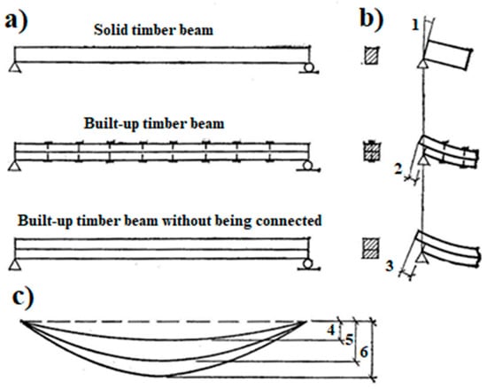 The types of timber beam [9]: (a) The different types of the beam; (b) the angle of rotation of the beam on the support (1—the rotation of the beam’s cross-section; 2—the interlayer slip between the top and the bottom layer of the built-up timber beam; 3—the interlayer slip between the top and the bottom layer of the solid timber beam without being connected); (c) the deflection for different types of the beams (4—the deflection for solid timber beam; 5—the deflection for built-up timber beam; 6—the deflection for built-up timber beam without being connected).