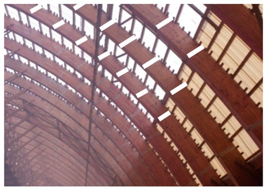 An example of strengthening timber arches using mechanical malleable bonds made of composite material (own photo). The white stripes are malleable mechanical bonds made of composite material [13].