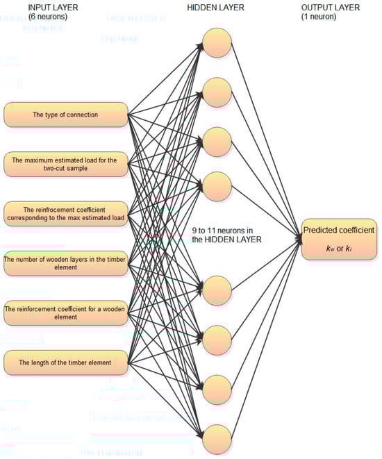 This research presents the implementation of machine learning to the determination of the compliance coefficient for the design of the built-up beam with composite mechanical malleable bonds. Based on data presented in Table 1, Table 2 and Table 3 and experimental data from [13,25], artificial neural networks are built, which allow for the estimation of the compliance coefficients kw and ki for mechanical malleable bonds made of different types of composite materials. Unfortunately, data, which are presented on the building standards [26], cannot be used because they were determined for different types of mechanical malleable bond such as nails, bolts, plates, oak key, and dowels. The artificial neural networks estimate the compliance coefficients and based on the following inputs: