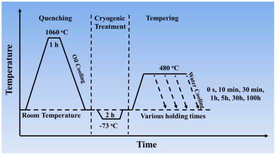 In order to clarify the mechanical properties of the two steels during the aging process, samples aged at 480 °C for various holding times, including 0 s (after cryogenic treatment), 10 min, 30 min, 1 h, 5 h, 30 h, and 100 h were prepared, and water quenching was chosen after aging treatment. The detailed temperature profiles of heat treatment are shown in Figure 1. Then, the samples were machined into standard specimens for tensile tests and Charpy impact tests.