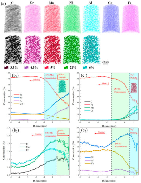 APT results of Co−free steel after aging for 5 h. (a) Three−dimensional spatial distribution maps of elements, flags represent corresponding elements atom concentrations. (b1,b2) Element concentrations (at. %) of β−NiAl. (c1,c2) Element concentrations (at. %) of M2C.