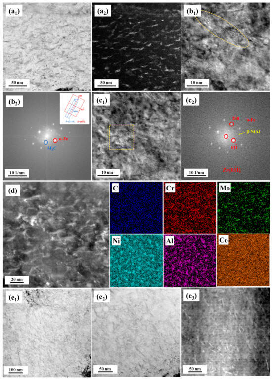 TEM images of precipitates in the steel after aging for 100 h. (a–d) 10% Co−alloyed steel, (e) Co−free steel. (a1,a2) bright field and dark field images, (b1) high−resolution TEM image, (b2) fast Fourier transform (FFT) of M2C corresponding to yellow circle in (b1), (c1,) high−resolution TEM image, (c2) FFT of β−NiAl corresponding to yellow square in (c1), (d) element maps, and (e1–e3) bright field and dark field images.