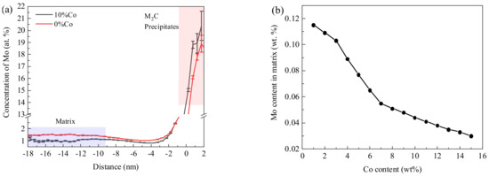 The effect of Co on volume fraction of M2C carbide was related to the solubility of Mo in the matrix [30]. The Mo contents in M2C particles and matrix were analyzed using 3D−APT, and the results are shown in Figure 6a. It can be seen that after adding 10% Co, the Mo content in the matrix significantly decreased as that in the M2C carbide increased. The variation of Mo contents in the matrix were also calculated using Thermo−Calc software, and the Co content varied from 1% to 15%, as shown in Figure 6b. It can be seen that as the Co content increased, the Mo content in the matrix gradually decreased, which corresponded with the experimental results.