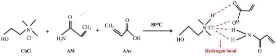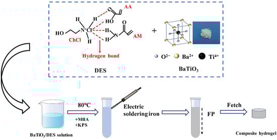 Choline chloride (ChCl), acrylic acid (AA), acrylamide (AM), potassium persulfate (KPS), and barium titanate nanoparticles (BTNPs) were purchased from Shanghai Aladdin Biochemical Science and Technology Co., Ltd. (Shanghai, China). The BTNPs reagent contained 99.9% of the main ingredient and the particle size was less than 100 nm. N,N-methylene bisacrylamide (MBA) was purchased from Tianjin Kemo Chemical Reagent Ltd. (Tianjin, China) and can be used directly. Before usage, it is necessary to subject ChCl to vacuum drying at a temperature of 70 °C for two hours to eliminate any absorbed water. All the reagents used have a high purity level, meeting analytical grade standards.