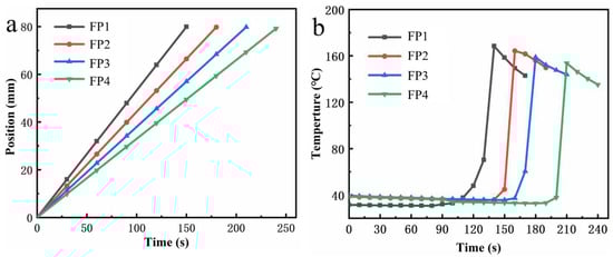 (a) shows the hydrogel’s front end’s position over time; (b) shows the hydrogel’s front end’s temperature over time.