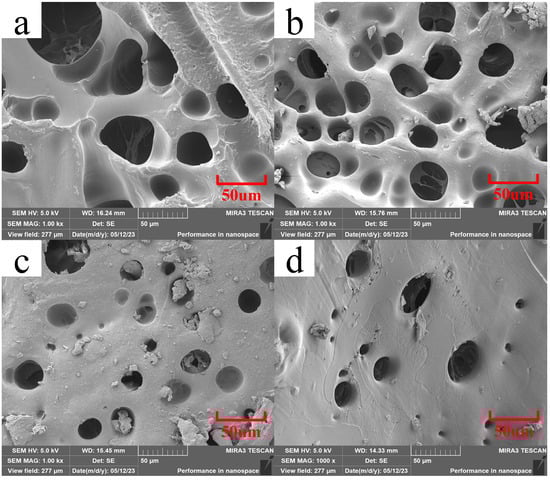 Scanning electron microscopy was used to examine the hydrogel’s microscopic structure and determine how the BTNPs content affected the hydrogel’s morphology. As shown in Figure 4, the composite hydrogel had different microscopic morphologies with different BTNPs content. The figure indicates that when BTNPs were not added, the composite hydrogel had a porous and loose surface with a large pore size. However, an increased BTNPs content made the composite hydrogel’s surface denser, and the pore size gradually decreased. The formation of the porous structure may be related to high polymerization temperature and a rapid temperature increase. The high reaction temperature can vaporize solvents and monomers in the system, decompose the initiator, and form bubbles. After the bubbles are formed, they are captured by the viscous reaction system, creating pores. Increased BTNPs content formed tighter cross-linked structures in the hydrogels [19]. This phenomenon could be attributed to the increased surface area to volume ratio of BTNPs, which facilitates their interaction with the hydrogel polymer chains.