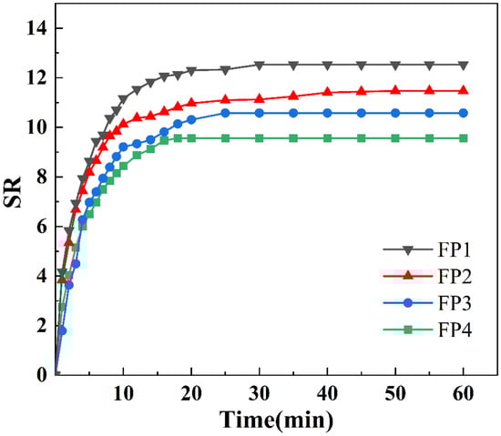 Figure 6 displays the composite hydrogels’ swelling kinetic curves in deionized water. It is evident from Figure 6 that, after increasing the amount of BTNPs in the composite hydrogels from 0 weight percent to 0.6 weight percent, the four groups of composite hydrogels reached the swelling equilibrium in approximately 40 min, with only a slight variation in the time required to reach the swelling equilibrium. Nevertheless, the composite hydrogels experienced a gradual reduction in equilibrium swelling as the BTNP content increased. Specifically, the equilibrium swelling of FP1–FP4 was measured at 12.42, 11.02, 10.3, and 9, respectively. BTNPs exhibit hydrophobic characteristics. These nanoparticles may create microenvironments in hydrogels that change the hydrophilic equilibrium of the polymer chain segments. This can impact how nearby water molecules are arranged and how hydrogen bonds are formed between polymer chain segments [24]. At the same time, if the BTNPs aggregate within the hydrogel, this could result in an uneven internal structure, which would impact the hydrogel’s ability to transfer water molecules [25]. In the SEM images of composite hydrogels, we found that the presence of BTNPs increases the cross-link density of hydrogels, affecting the equilibrium swelling of hydrogels.