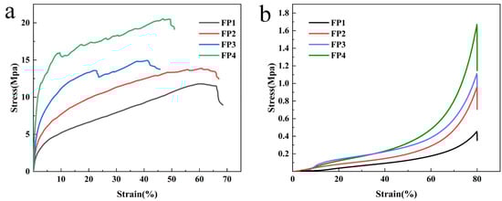 The tensile and compressive stress–strain curves of the hydrogels are illustrated in Figure 7. Based on the data in Figure 7a, the FP1~FP4 hydrogels exhibited maximum tensile stresses of 11.73 MPa, 13.88 MPa, 14.93 MPa, and 20.56 MPa, respectively. The tensile strength of the composite hydrogels was enhanced as the content of BTNPs increased, and the highest tensile stresses of the FP4 hydrogels were 1.8 times greater than those of the FP1 samples. The compressive strength of the composite hydrogel increased gradually as the amount of BTNPs increased, as shown in Figure 7b. The maximum compressive strength of the FP4 hydrogel was 131.09 MPa, 3.68 times greater than that of FP1 (which had a maximum compressive strength of 35.57 MPa). The enhanced mechanical properties of the composite hydrogel can be attributed to the role of barium titanate nanoparticles as cross-linking agents, reinforcing the three-dimensional network structure of the hydrogel [26]. This cross-linking action improves the hydrogel’s stability and, as a result, the composite hydrogel’s mechanical qualities.