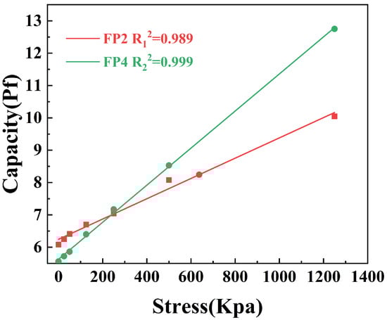 The composite hydrogel was prepared in a mold as a film of 2 cm × 2 cm in size, and the capacitance of the composite hydrogel was tested using a TH2827C precision LCR digital bridge (Suzhou New Tonghui Electronics Co., Ltd., Suzhou, China) Weights were used to apply pressure to the composite hydrogel, and, in order to produce an obvious deformation of the composite hydrogel after being subjected to pressure, 30 × 30 tiny protrusions were prepared on the surface of the composite hydrogel film using a mold to make the capacitance change more obvious. The obtained experimental data were fitted.