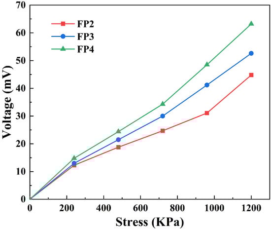 Figure 9 illustrates a progressive increase in the produced voltage of the composite hydrogel as the applied pressure on the hydrogel increases. This is because the pressure deforms the barium titanate in the composite hydrogel, and the dipoles within the hydrogel are aligned in the direction of the external stimulus. Consequently, a potential difference between the upper and lower surfaces of the hydrogel is generated, resulting in an electric field within the hydrogel [29]. More dipoles in the composite hydrogel result in a larger potential differential between the top and lower surfaces and a higher voltage created as the barium titanate concentration of the hydrogel gradually increases. Therefore, it can be observed from Figure 9 that, with the increase in the content of barium titanate nanoparticles, the voltage generated from FP2 to FP4 gradually increases when subjected to the same pressure. Due to their distinctive physicochemical characteristics, BTNPs/P(AM-co-AA) composite hydrogels are mostly utilized in energy conversion and sensing applications. For instance, it may function as a sensor in intelligent materials to detect and respond to various stimuli such as temperature, pH, electric field, and more. Alternatively, its electrochemical characteristics can effectively convert and store energy in energy-harvesting devices.