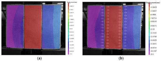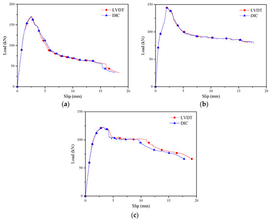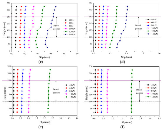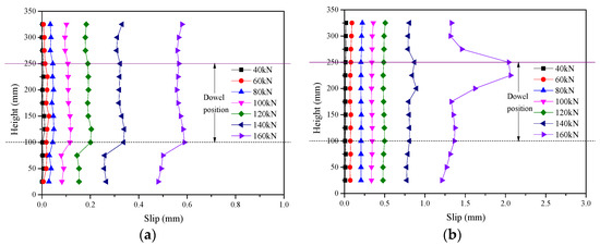 - The slip distribution pattern of the shear connections was obtained based on the DIC-measured full-field displacement data. Before loading, the force transfer of the connectors was stable. During loading, the shear stiffness of the specimens continuously decreased. Prior to reaching the ultimate load, the slips on the left and right sides of the specimen were basically consistent, indicating no eccentric loading, and the connections on both sides were uniformly loaded. As the ultimate load approached, concrete failure at the dowel locations of the CIP dowel specimens resulted in relatively large local slips.