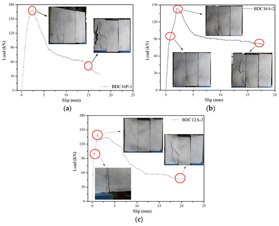 - The load-slip curve of shear connections could be roughly divided into three stages. In the first stage, there was an approximately linear relationship between the load and the relative slip of the specimen. In this stage, the connectors effectively connected the bamboo and concrete, ensuring reliable shear transfer. In the second stage, the rate of load increase slowed down significantly, the slip rapidly increased, and the load-slip curve became nonlinear, mainly due to local cracking of the concrete leading to a reduction in shear stiffness. In the third stage, the curve started to decline, primarily due to local cracking and failure of the concrete block, yielding deformation of the connectors, and a decrease in the bonding strength between the connectors and concrete.
