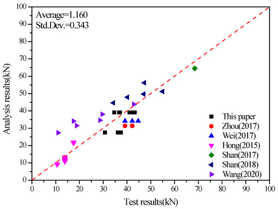 - Drawing from existing research on timber-concrete and steel-concrete shear connections, the shear mechanism of the connections was analyzed based on the characteristics of the specific connections under load to clarify the main factors affecting the shear capacity of the shear connections and the contributors to shear capacity. Based on Saulius’ theory, an accurate equation was proposed for calculating the shear capacity of dowel bamboo-concrete shear connections.
