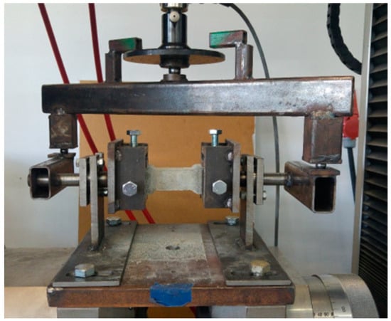 The stand was composed of elements connected with articulated joints. The force was transferred from the compression testing machine to the crossbeam via a ball joint (see Figure 4). Next, the crossbeam transmitted the force into two arms via ball joints. The arms were connected to the spin shafts equipped with sample holders (see Figure 5). The testing machine with a range of 20 kN and an accuracy of 0.5% was used in the tests. The testing procedure consisted of controlling the relation between distance and speed of the machine’s traverse. Up to a displacement of 0.1 mm, the speed was 0.1 mm/min; above 0.1 mm, the speed was increased to 0.2 mm/min.