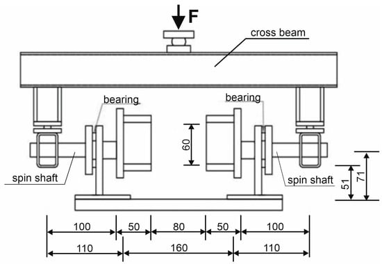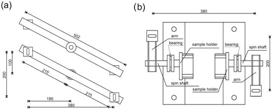 A scheme of the stand for performing torsion tests: (a) top and bottom view of the loading crossbeam and (b) top view without the loading crossbeam (mm).