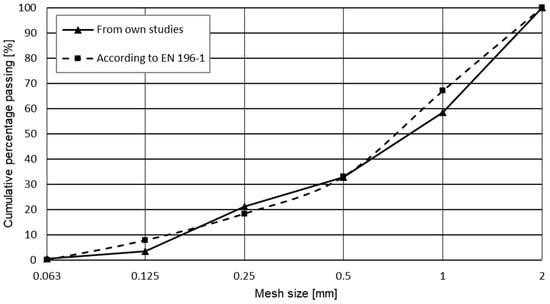 The course of the grading curve of the tested aggregate (see Figure 6) deviates only slightly from the curve recommended by the European standard EN 196-1 [39].