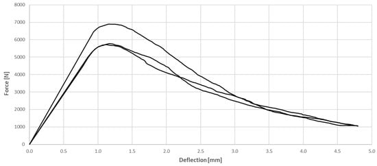 Figure 7 and Figure 8 present the relationship between force and deflection of the tested SFRC and WTSFRC, respectively. The maximum force of tested specimens was achieved for SFRC; also, the curves are smoother compared to the WTSFRC results. The force–deflection relationship for the cement matrix has not been studied. The maximum values of flexural strength for all composites are provided in Table 4.