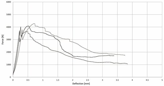 The destruction model of the tested specimens was similar for most of the tested specimens. After reaching the maximum value of the destructive force, a crack appeared in the sample at angle of about 45 degrees to the longitudinal axis of the specimen (see Figure 9 and Figure 10).