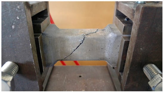 The molds for the torsion test specimens were made from PET-G using a 3D printer. The molds consisted of two parts screwed together with 4 screws. Three samples were made from a single mold. Specimens intended for the torsion tests were characterized by a rectangular and circular cross-section and formed in such a way that the failure occurred in the narrowed zone (see Figure 2). The cross-section area of the narrowed zone was on average 716 mm2 and 947 mm2 for the circular and the rectangular cross-section shape, respectively. The specimens were mounted in the apparatus dedicated for the torsion test (see Figure 3). Six specimens were tested for each type of cement composite and cross-section shape. 72 specimens were tested in total in the torsion tests. All samples were cured in the same temperature (20 °C) and humidity (100%) conditions for 28 days. After one day, the samples were demolded.