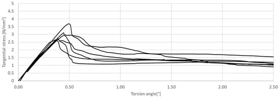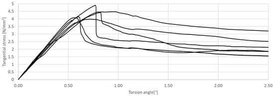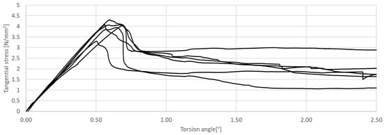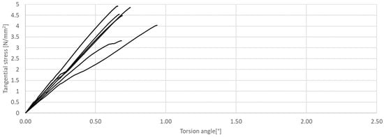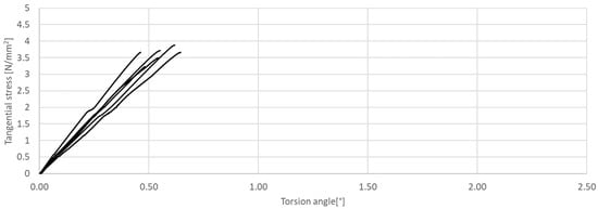 Tangential stress in correlation with torsion angle of the tested CM, circular cross-section.