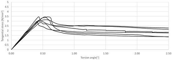 Based on the cracking moments, it is possible to determine the values of tangential stress. The values of tangential stress at the moment of cracking the elements are presented in Table 7 (column MCR). In addition, the same table shows the values of tangential stresses for the torsion angle of 2.5°.