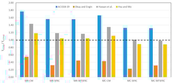 A comparative analysis of experimental and empirical cracking moments is presented in Figure 17. It shows that the moment values calculated using the ACI 318-19 [40] method are significantly lower than the experimental values obtained. Therefore, this method is not recommended for use with the composites analyzed. The calculation method proposed by Okay and Engin [43] is also not recommended for assessing the bending moments of the composites analyzed, as the theoretical values obtained are significantly higher than the experimental values. At the same time, it should be noted that the application of this method provides a safety margin. Among the other two methods, [41] and [42], the best agreement between theoretical and experimental values of cracking moments was obtained with the Hsu and Mo [42] method. This is likely due to the fact that this calculation method for cracking moments takes into account the addition of dispersed reinforcement.
