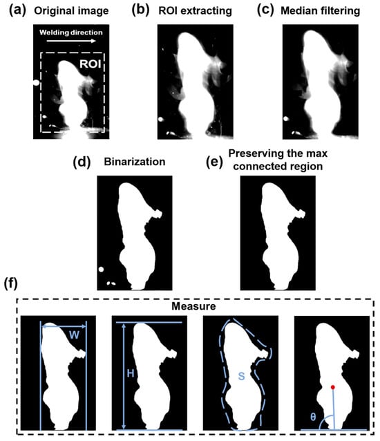 This work extracted the plume morphological features in the welding process, including the width, height, area, and angle. The image procedure is displayed in Figure 2. The first step was to select and crop the original image regions of interest (ROI), as shown in Figure 2a,b. Figure 2c shows the median filtering method that was utilized to remove noise in the images. In addition, the Otsu threshold method [25] was used in ROI to realize threshold segmentation in Figure 2d. After that, the maximum connect region was regarded as the morphology of the plume, as shown in Figure 2e. Finally, the features of the laser plume were quantified, including the width W (the difference in horizontal coordinate between the right- and leftmost point in connected domain), the height of plume H (the difference between the highest and lowest pixels), the area S (the total area of pixels with a gray level of 255, the total number of points in connected domain), and the inclination angle θ (the inclination degree between the horizontal line and the line formed by the centroid of connected domain and the middle point of bottom).