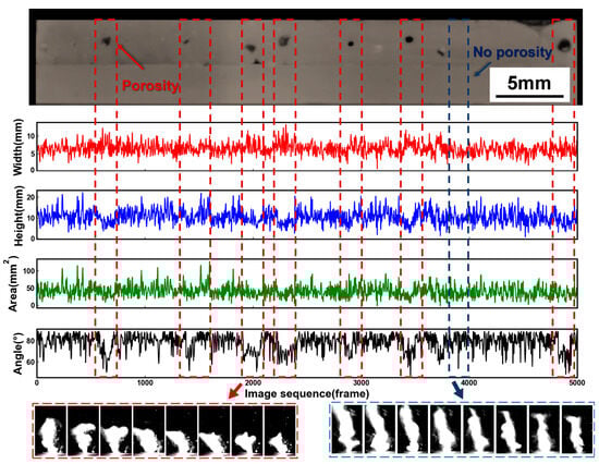In recent years, the monitoring of keyhole-induced pores based on visual signals has attracted much attention. The signals have been collected through high-speed cameras, and different machine learning (ML) methods have been utilized to establish the relationships between the visual signals and keyhole-induced pores [6,7,8]. Luo et al. [8] established a radial basis function neural network model (RBFNN) to estimate the keyhole area in the laser welding process. They realized the detection of weld pores based on the abnormal fluctuation in the keyhole area. Zhang et al. [9] extracted the molten-pool features from a single image as the input of a convolutional neural network (CNN) to identify the keyhole-induced pores. The network had a 75% accuracy in predicting the porosity near the top surface but less accuracy in predicting deep porosity close to the bottom surface. An important reason for the low accuracy is that the migration of the porosity in the weld pool was not considered. Researchers have discovered that keyhole-induced pores migrate with the flow of the molten pool [5,10], which indicates that the locations of pore defects are different from where the pores are formed. Due to the migration of keyhole-induced pores, the method of feature extraction based on a single image only finds the positions of the pore formation rather than the pore defect location. Regarding the deep pores mentioned above, obvious pore migration results in large prediction errors. Therefore, it is necessary to consider pore migration when detecting keyhole-induced pores.